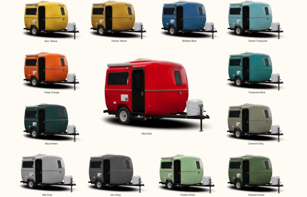 De E13 van Escape is 4,2 meter lang en ruim 4,5 meter als je het optionele reservewiel aan de achterwand hangt. De breedte bedraagt 2 meter en de stahoogte binnenin is 1,90 meter. De caravan heeft een leeggewicht van 839 kilogram en een maximaal toelaatbaar totaalgewicht van 1.134 kg. Binnen vind je een tweepersoons bed achterin en een dinette voorin, die kan worden omgebouwd tot slaapplek voor 1 persoon. De keuken is uitgerust met een tweepits gasfornuis, een spoelbak en een koel-vriescombinatie van 85 liter. Er is geen plek voor een badkamer, maar je kunt wel een draagbaar toilet onder een van de zittingen verbergen. De Escape E13 kost USD 24.000 en is leverbaar in maar liefst 13 kleuren (zie foto boven).