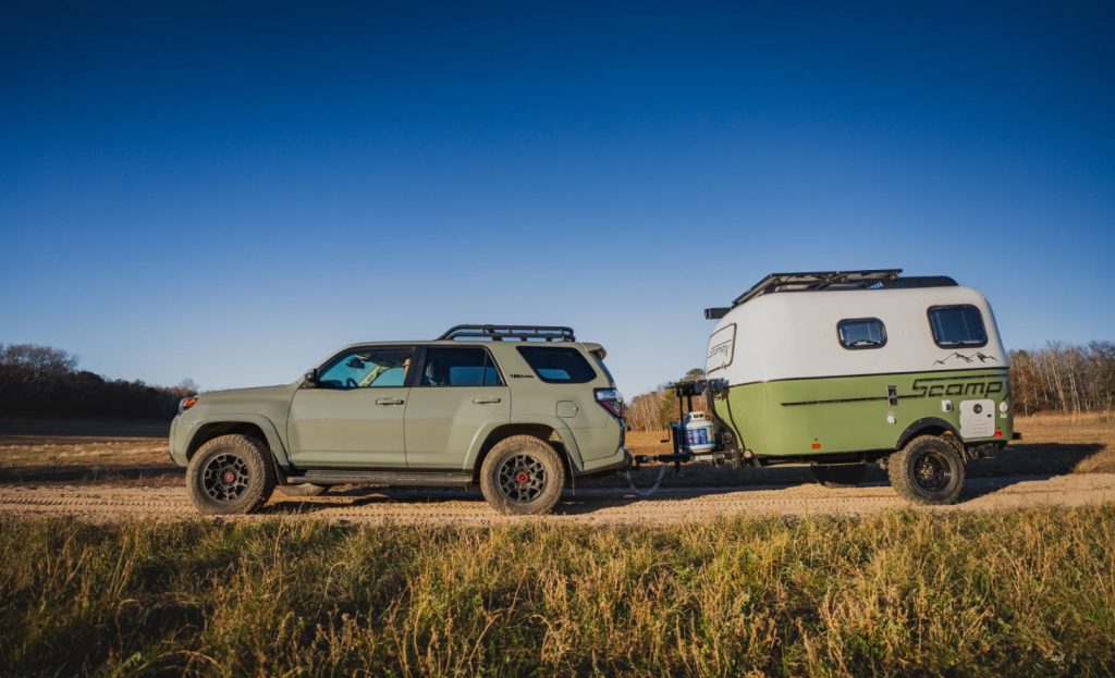 Scamp is in Noord-Amerika een iconisch merk met een rijke geschiedenis en hun assortiment is qua uiterlijk vrijwel onveranderd ten opzichte van de klassieke glasvezel-caravans uit de jaren ’60 en ’70. Onlangs presenteerde het Amerikaanse bedrijf zijn eerste offroad-versie, de Scamp X (zie foto beneden) en die is voorzien van een versterkt onderstel en terreinbanden. De bodemvrijheid bedraagt daardoor 46 centimeter, oftewel 15 centimeter meer dan standaard-model Scamp 13. Qua interieur kun je opteren voor een versie met stapelbed van 193 x 76 centimeter in combinatie met een tweepersoons bed van dezelfde lengte en een breedte van 137 centimeter. De keuken heeft een fornuis, koelkast en spoelbak, terwijl net als in de Escape geen plek is voor sanitair. Het leeggewicht bedraagt 900 kilogram.