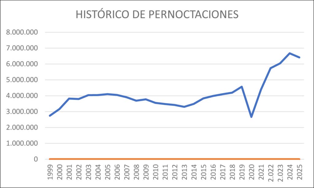 De federatie van campinghouders in de regio Andalusië publiceerde de cijfers over 2025 en daaruit bleek dat er meer dan 6,4 miljoen nachten is gekampeerd. Alleen in 2024 lag dat aantal nóg hoger, namelijk op bijna 6,7 miljoen. Dat betekent weliswaar een een daling van 3,9%, maar desondanks beschouwt de branchevereniging het jaarsaldo als zeer positief. Dit meldde de Federación Andaluza de Campings(FAC) na analyse van de meest recente gegevens van het Spaanse Centraal Bureau voor de Statistiek. In 2019, het jaar voor de coronapandemie, werden zo’n 4,5 miljoen campingnachten genoteerd. Zie de grafiek hieronder.
