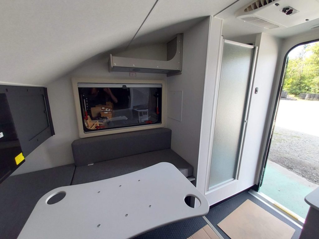 Binnenin zien we een keukenblokje met fornuis, spoelbak, koelkast, afzuigkap én een magnetron op ooghoogte. Daar tegenover is een douchecabine ingetekend (zie foto onder), inclusief cassettetoilet, terwijl de Ascape ook over een buitendouche beschikt. Bovenop het dak is een airco geplaatst. Verder is het interieur met alleen een eethoek vrij minimalistisch, hoewel je die zitgroep kan ombouwen tot een tweepersoons bed.