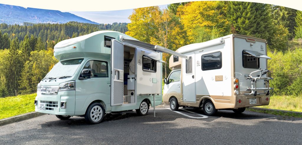 Met een hoogte van slechts 2,51 meter en een breedte van minder dan 1,70 meter hoef je in elk geval niet op zoek naar een externe stallingsplek. Heb je zelf een garage, dan past de JP Star Happy daar waarschijnlijk gewoon in. En anders kan dit campertje in een standaard parkeervak op straat. Verder heb je praktisch alles aan boord voor een comfortabele vakantie: een keukenblok met spoelbak en koelkastje, airco en een zonnepaneel. Een sanitaire ruimte past er uiteraard niet in, maar je krijgt wel een buitendouche en naar wens een draagbaar toilet. In Japan wordt er voor de versie met turbo-motor bijna 6 miljoen yen gevraagd, oftewel zo’n €32.000, en er is keuze uit kekke exterieurkleuren, zoals oranje en mintgroen (zie foto onder). Benieuwd of we zulke Japanse mini-campers ook ooit hier op de weg gaan zien!