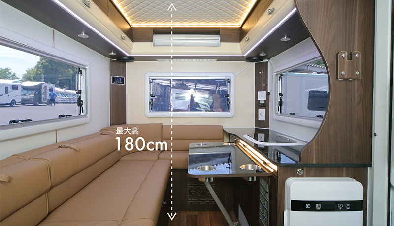 Wat sowieso knap is van de Japanse bouwers is dat ze een stahoogte van 1,80 meter in het interieur hebben weten te creëren (zie foto beneden). Daarnaast herbergt de JP niet alleen 4 slaapplaatsen, maar óók 4 gordelplaatsen voor tijdens de reis. Je kan dus gewoon met hele gezin van papa, mama en 2 kinderen op vakantie. Voor de bagage en al het campingmeubilair heb je wellicht nog een aanhangertje nodig, maar goed… In de alkoof boven de cabine klap je een bed tevoorschijn van bijna 1,80 meter lang en 1,45 meter breed, dus prima voor 2 kinderen (of volwassenen die niet uit de kluiten zijn gewassen). Beneden transformeert de loungebank tot een bed van ruim 2 meter lang en 114 centimeter breed. Tot de wekker gaat zal iedereen wel op z’n plek moeten blijven liggen, want bewegingsruimte is er dan verder niet.