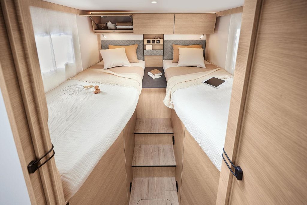 De Franse camperfabrikant Rapido, onderdeel van de Trigano-groep, verrast met de lancering van de C66 Optimum Line. Dit is een halfintegraal-camper van net geen 7 meter lang en slechts 217 centimeter breed. Ondanks zijn compacte formaat biedt de Fransman achterin twee aparte bedden in de lengterichting (zie fotot helemaal beneden) én een aparte douche en WC. Middels een deur kan het slaapgedeelte samen met de sanitaire ruimte worden gescheiden van de keuken, terwijl voorin de zitplaatsen tegenover elkaar geposteerd zijn.