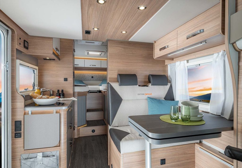 Achterin de Spicy-camper slaap je op bedden in de lengte die ook transformeren tot één groot tweepersoons bed, terwijl je boven de zitgroep een hefbed tevoorschijn kunt toveren. Vanzelfsprekend beschikt deze Weinsberg ook over een compleet uitgeruste keuken en badkamer met alles erop en eraan. Een Thule-luifel van ruim 4 meter lang is tevens inbegrepen, terwijl de stahoogte in het interieur maar liefst 2,10 meter bedraagt. Het rijklaargewicht is minder 3.000 kilogram en de totale toegestane massa is 3.500 kilogram.