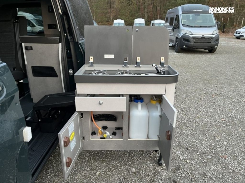 De Campstar is uitgerust met een compleet keukenblok dat via de schuifdeur ook naar buiten te zwenken is (zie foto boven). Bij de Vanstar heeft Pössl ervoor gekozen om de campervan zónder vaste keuken uit te rusten. In plaats daarvan heb je bijvoorbeeld wel een uitklapbaar inductieplaatje om te koken. Superpraktisch als je de camper ook voor andere doeleinden wil gebruiken, maar dat is dan ook de reden dat de Nederlandse overheid deze uitvoering een halt toeroept. Om in aanmerking te komen voor het predikaat ‘kampeerauto’ en daarmee dus ook de korting op de motorrijtuigenbelasting, moet het voertuig voorzien zijn van onder andere een keukenblok met ‘vast’ kooktoestel en werkblad van minimaal 60 centimeter hoog, een spoelbak met kraan en afvoer, én vaste kasten of opbergruimte voor ‘kampeeruitrusting’. Overigens geldt een ingebouwde magnetron ook als ‘kookgelegenheid’.