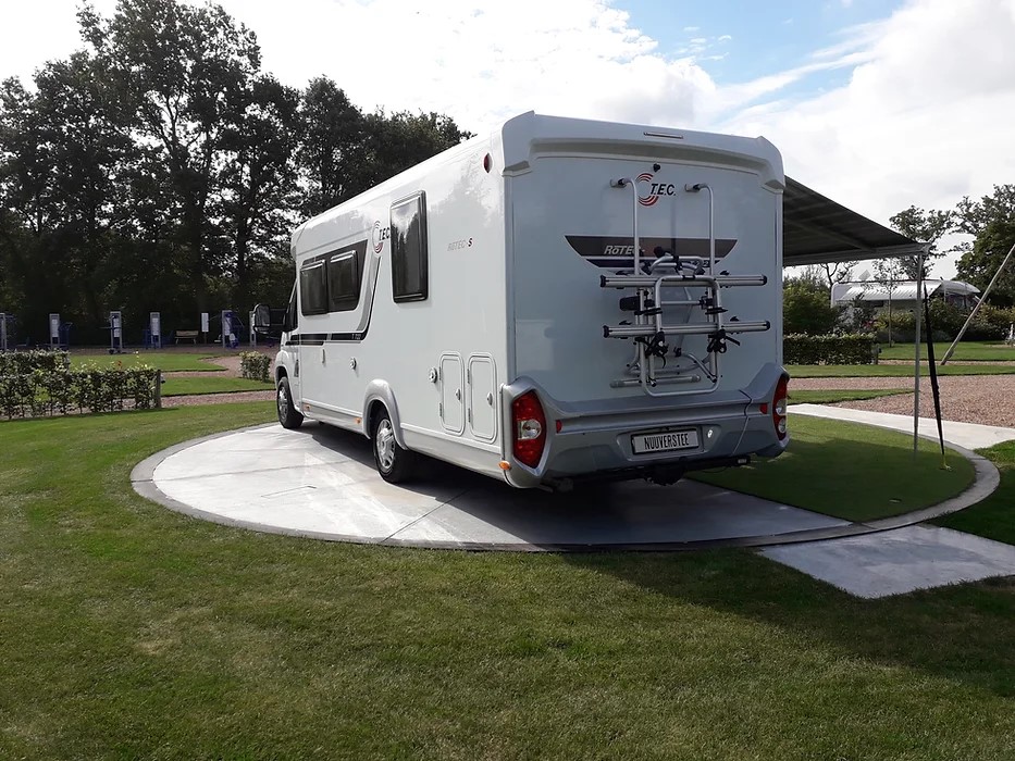 Wie van de 2 de eerste was, durven we niet te zeggen. Maar zowel in het Drentse Borger als in het Deense Ribe waren ze in elk geval zéér ingenieus. Op camperpark Nuuverstee hebben ze 34 ‘gewone’ plekken voor kampeerauto’s en sinds enkele jaren kun je daar ook één heel bijzonder plekje reserveren, namelijk die met het draaiplateau (zie foto beneden). Die plaats is geschikt voor campers van maximaal 8 meter lang en hooguit 4.000 kilogram zwaar.