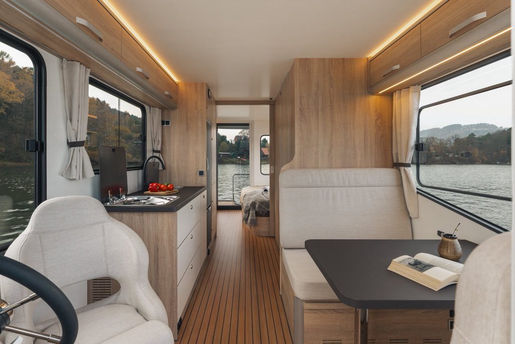 De Aquamper staat op een op maat gemaakte trailer met 3 assen en is 9,1 meter lang en 2,5 meter breed. Al varend bedraagt de diepgang slechts 35 centimeter, waardoor je dus vrij eenvoudig door ondiep water kunt komen. Volgens de Poolse producent is een vaarbewijs niet nodig. Het interieur (zie foto onder) is voorzien van een slaapkamer voor 2 personen, een eethoek, ruime keuken en een badkamer. Zowel aan de voor- als aan de achterkant kun je op een eigen terras genieten van een kopje koffie of een borrel.