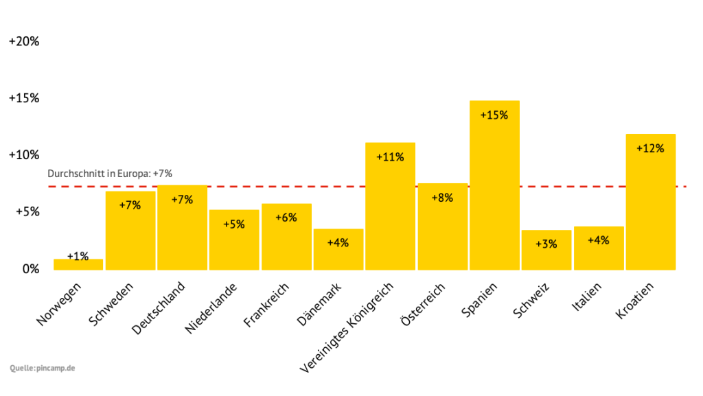 Ben je van plan om te gaan kamperen in Denemarken, dan betaal je daar komend hoogseizoen net iets meer dan het Europese gemiddelde. Zak je echter af naar het zuiden, dan kost dat een flinke duit extra. Uitschieter is Kroatië, waar de campings gemiddeld €73 per nacht vragen voor een gezin met 1 kind; €10 meer dan in Italië en €12 meer dan in Zwitserland. Ook Spanje ligt op basis van het Duitse onderzoek fors boven het Europese gemiddelde. Over de hele linie zijn de kampeertarieven in Europa dit jaar met 7% gestegen ten opzichte van 2025 (zie grafiek hierboven), waarbij de Spaanse campings met een toename van 15% de kroon spannen. In Kroatië (+12%) en het Verenigd Koninkrijk (+11%) zijn de prijzen ook behoorlijk opgeschroefd, terwijl Nederlandse campings het met een plus van 4% vrij bescheiden houden.