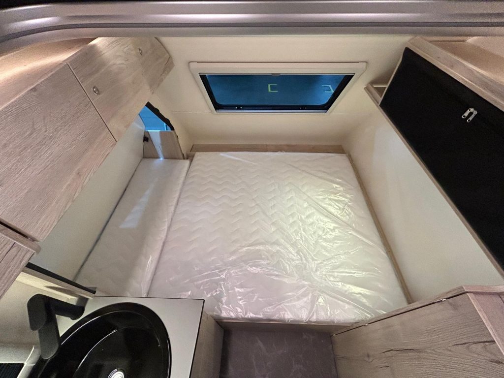 In de originele GetAway kun je met 2 personen voorin in de lengterichting riant slapen, maar om de caravan geschikt te maken voor extra personen is nu in het prototype een dwarsbed geplaatst. Echter, conform het aerodynamische principe van Easy Caravanning moet de GetAway wel smal blijven. Om toch dwars te kunnen slapen én daar een bed van meer dan 2 meter lengte te kunnen realiseren, hebben de knappe koppen uit Drenthe een ingenieuze ‘klep’ bedacht. Je klapt aan het voeteneinde simpelweg een deel van de opbouw naar buiten, daar gaat een waterdichte hoes omheen en voilà: een volwaardig dwarsbed!