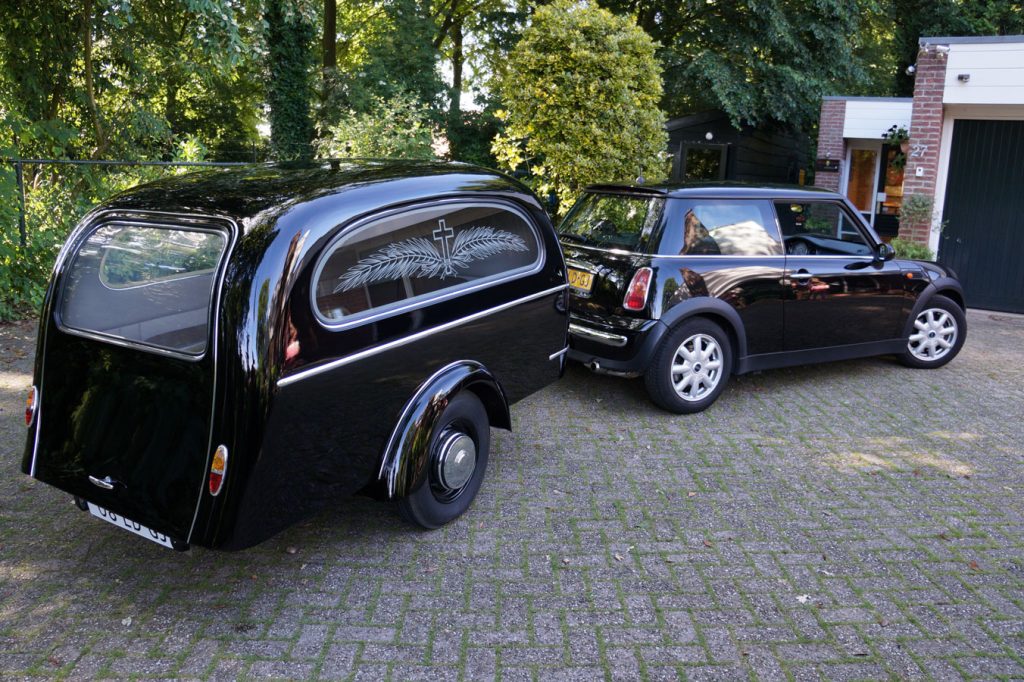 De ‘caravan’ c.q. aanhanger hierboven is uit 1965 en wordt aangeboden door een begrafenisonderneming in Voorthuizen. Daar kun je overigens ook kiezen voor de paardenkoets, een rouwbus, vrachtwagen en zelfs een speciale rouwbakfiets. Er lijkt slechts één aanbieder in Nederland die zich echt heeft gespecialiseerd. In het Brabantse Vlijmen, in de buurt van Den Bosch, vind je een uitvaartcaravan die dan ook het meest lijkt op de caravans zoals we die tegenwoordig op de camping zien (zie foto onder).