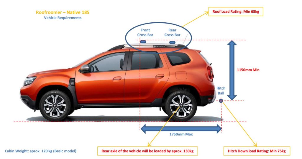 De Roofroomer Native wordt in 2 varianten aangeboden: model 200 is bedoeld voor grotere auto’s en de 185 is geschikt voor ‘mid-size’. Het doet denken aan een kampeermodule zoals die wel eens achterop een pick-up truck wordt gebruikt, maar jouw ‘normale’ auto dan wel SUV heeft natuurlijk geen laadbak om die campercabine in te plaatsen. En daar hebben de Serviërs dus iets op bedacht. Je hebt doorgaans overigens wél een SUV-model nodig, want er is minimaal een hoogte nodig van 115 centimeter (zie afbeelding) tussen de kogel van de trekhaak en de dakrails om de Native 185 te kunnen monteren.