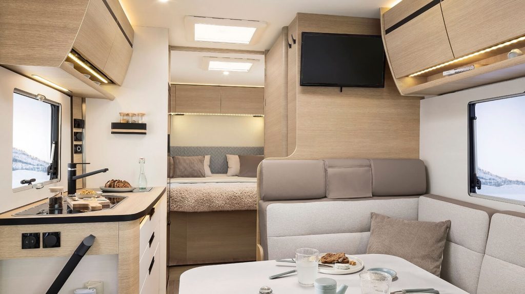 Niet alleen komt Rapido in het jubileumjaar met bovenstaande ’65 Edition’ en de wedergeboorte van de V62, ook worden 2 andere modellen geheel vernieuwd. Dat betreft de integraalcampers van de 8F- en 80dF-serie. Allereerst valt de nieuwe voorkant op, inclusief panoramische voorruit, die maar liefst 60 centimeter meer zicht biedt. De 80dF krijgt ook nog een nieuwe achterkant mee en in beide modelseries is het interieur geheel opnieuw vormgegeven. De 8F-serie onderscheidt zich met de komst van de 850F (zie foto beneden) van minder dan 7 meter lengte en uitgerust met een queensbed van 150 x 194 centimeter.